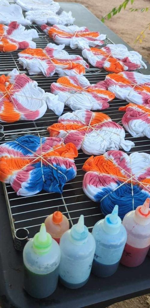 As for me…well, I was sitting outside dyeing for two days. Now before you get your undies in a bunch, what I mean is, I was doing that tie dye shirt order for Troy Story Band. Thirty-plus shirts is a sizable order and it definitely made me feel like I am not aging gracefully. I started Saturday morning and didn’t finish the process until Monday afternoon. I’m still sore.